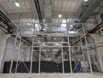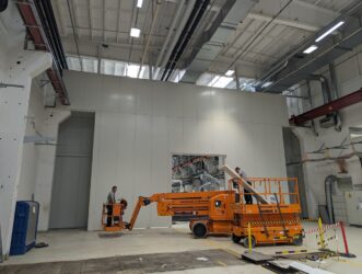 bestehend aus 8t Stahltragwerk und einer Wandfläche von 200m², Einbau der Wand während der laufenden Produktion unter extrem engen Platzverhältnissen